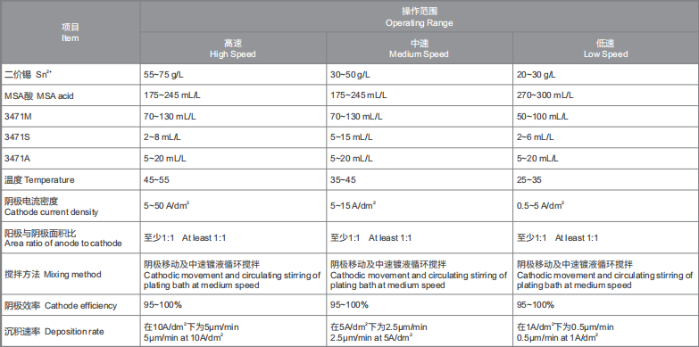 采用烷基磺酸体系,操作环境友好,体系稳定; 成分简单,操作⽅便,便于现场生产管理; 采用特殊添加剂,镀层结晶致密,结晶均匀,焊性能力优良; 泡沫低,易于清洗,抗高温变色能力强。